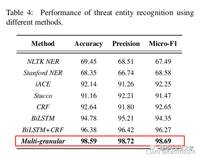 本文提取的13种主要的IOC性能如表3所示。总的来说,我们的IOC提取方法在精确率、召回率、平均F1值都表现出了优异的性能。然而,我们观察到在识别软件和恶意软件时的性能下降,这是因为大多数软件和恶意软件是由随机字符串命名,如md5。