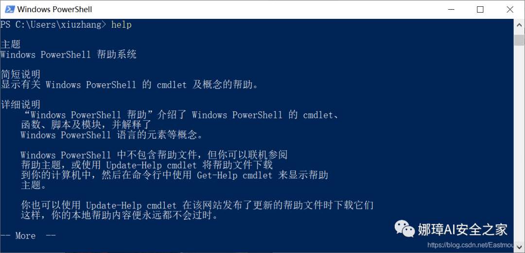同样,我们还以通过Windows终端提示符输入“PowerShell”,进入PowerShell命令行,输入help命令显示帮助菜单。