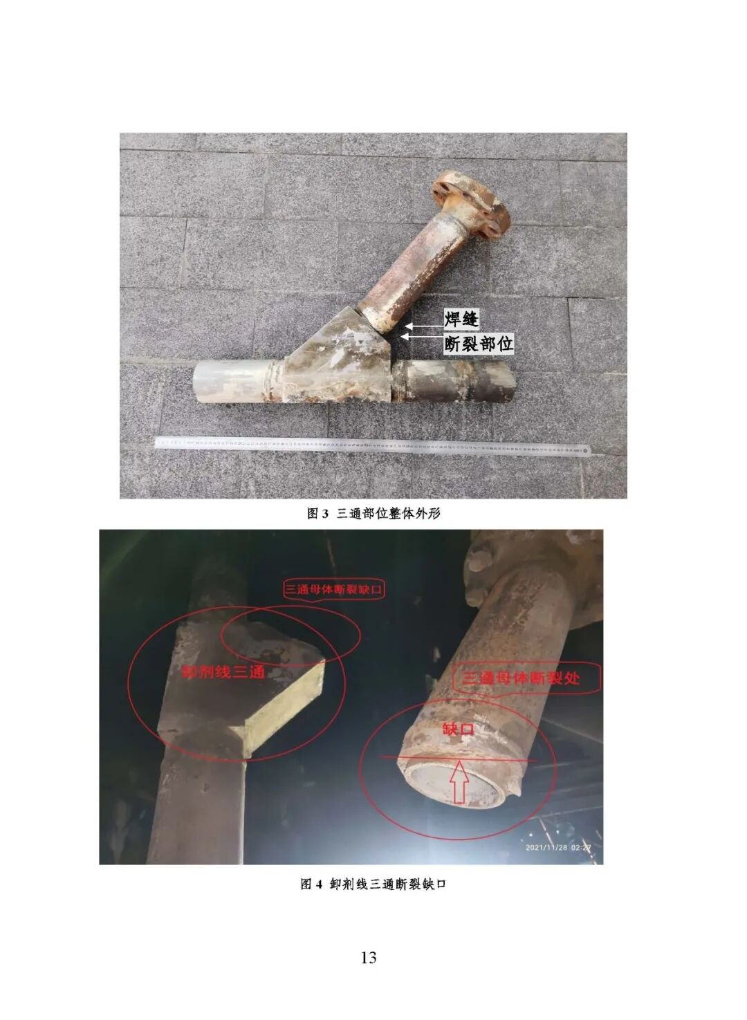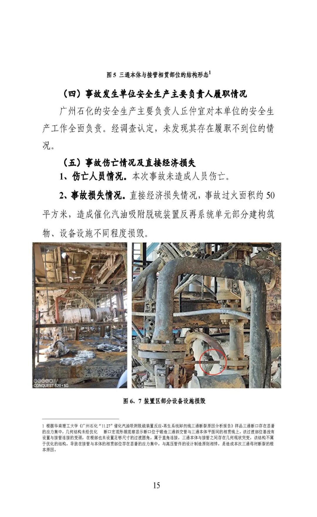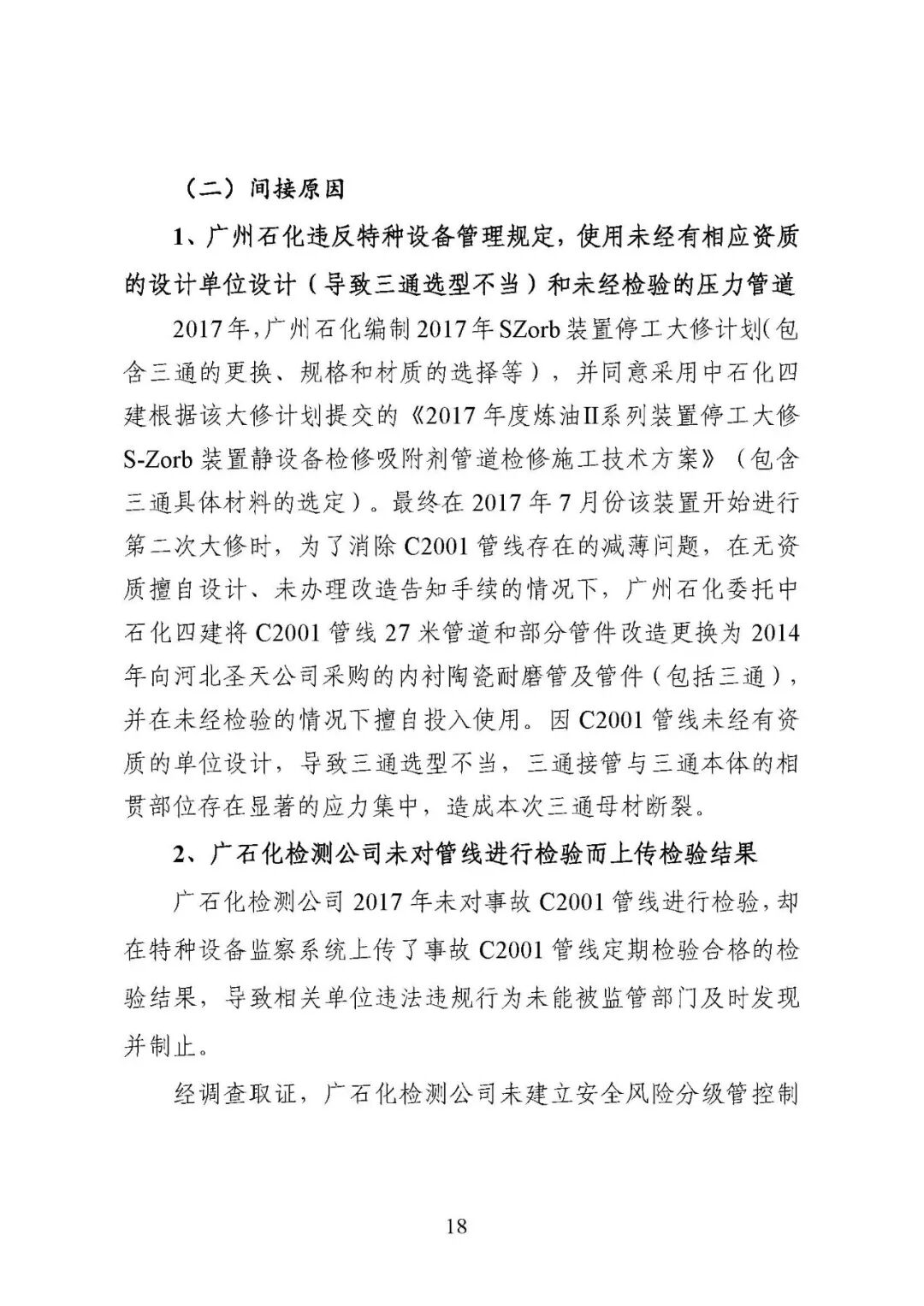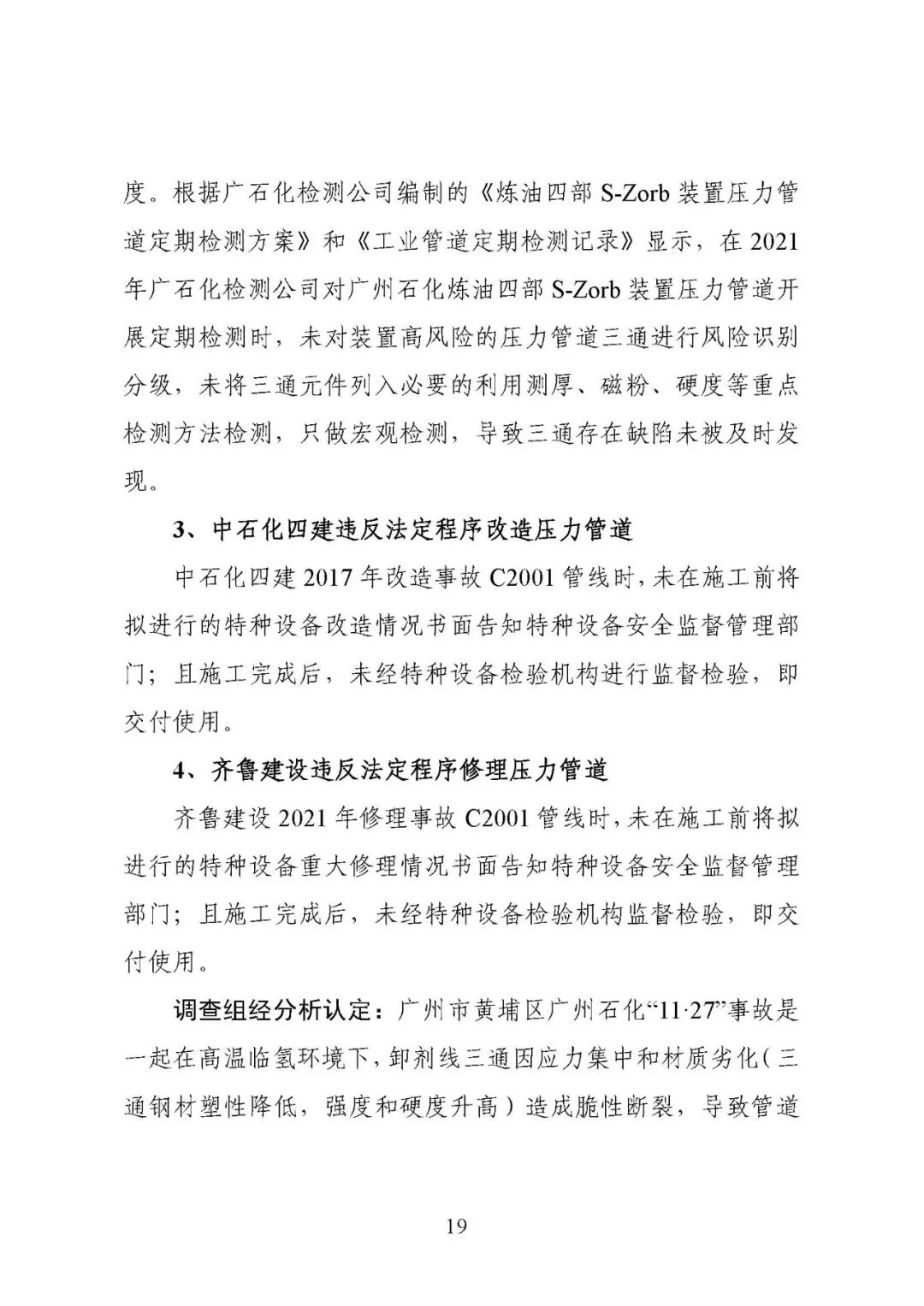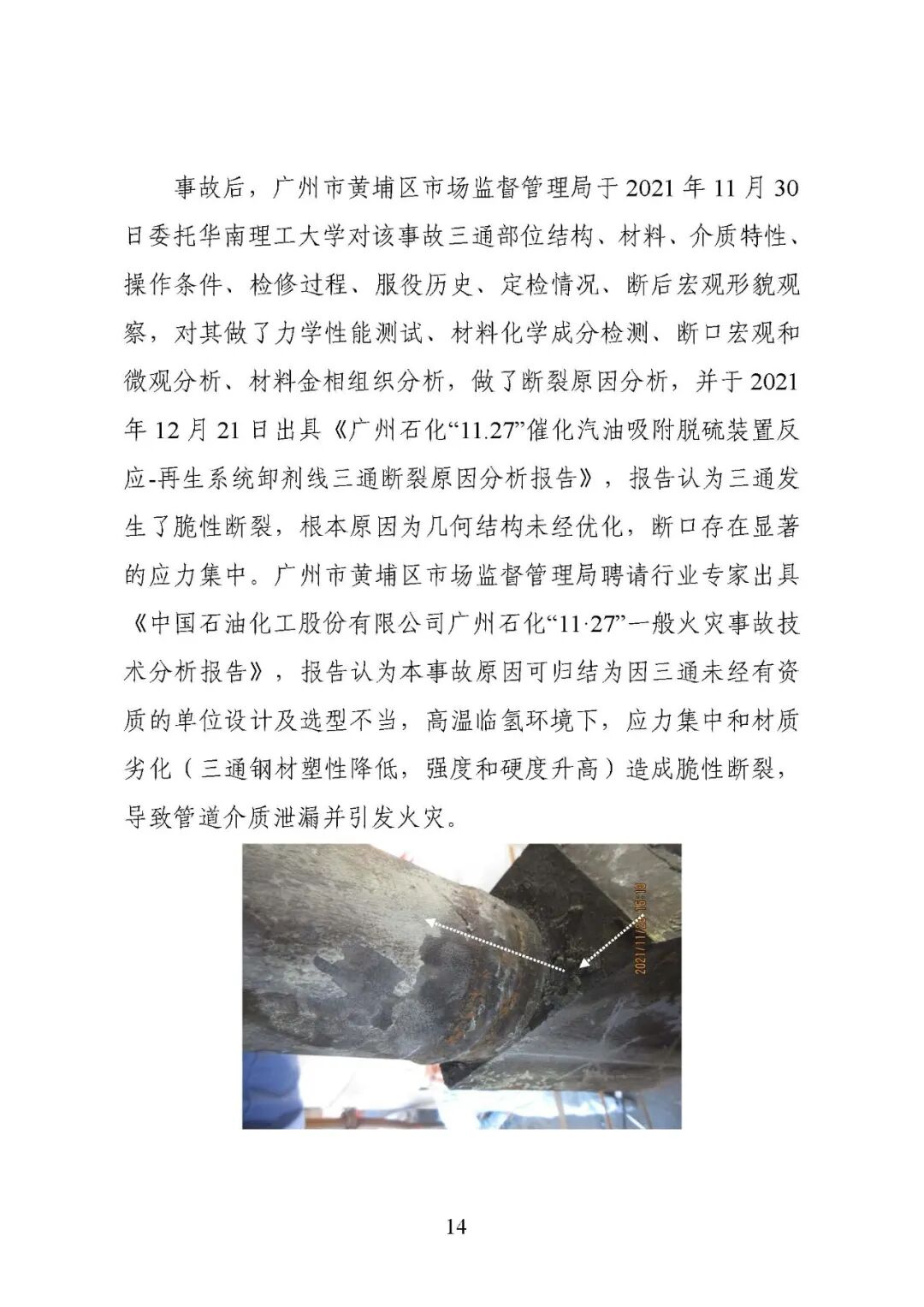 报告指出:事故的直接原因是高温临氢环境下,卸剂线三通部位因应力集中和材质劣化(三通钢材塑性降低,强度和硬度升高)造成脆性断裂,导致管道介质泄漏并引发火灾。