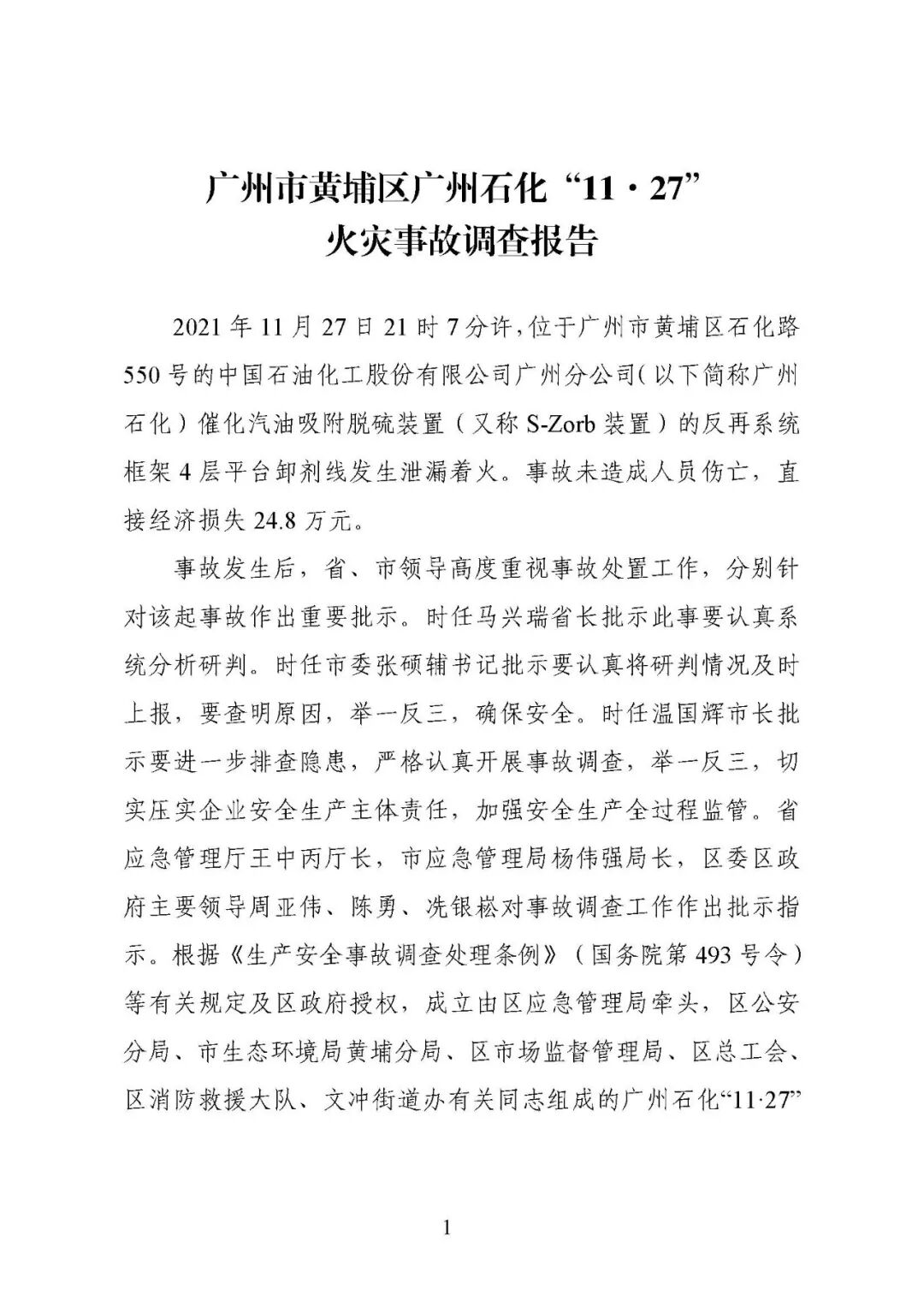 3月7日,广州市黄埔区应急管理局在官网发布了《广州市黄埔区广州石化“11·27”火灾事故调查报告》