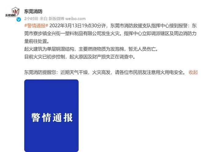 经了解,起火建筑为单层钢混结构,主要燃烧物质为发泡棉,暂无人员伤亡。目前火灾已初步控制,起火原因及财产损失正在调查中。