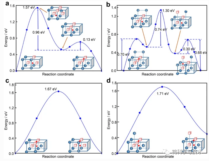图6 (a-b) H-V₃复合体和 (c-d) H₂-V₃复合体在钨中的迁移路径与势垒