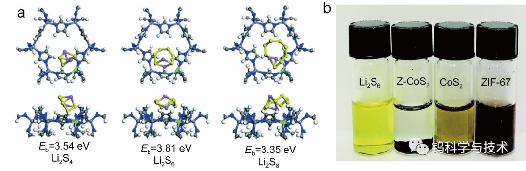 图7 a Ni-ZIF-8与Li2Sx ( x = 4、6和8)物种的结合构型和结合能;b Li2S6溶液和分别添加了Z-CoS2、商业CoS2和ZIF-67粉末后的Li2S6溶液照片。