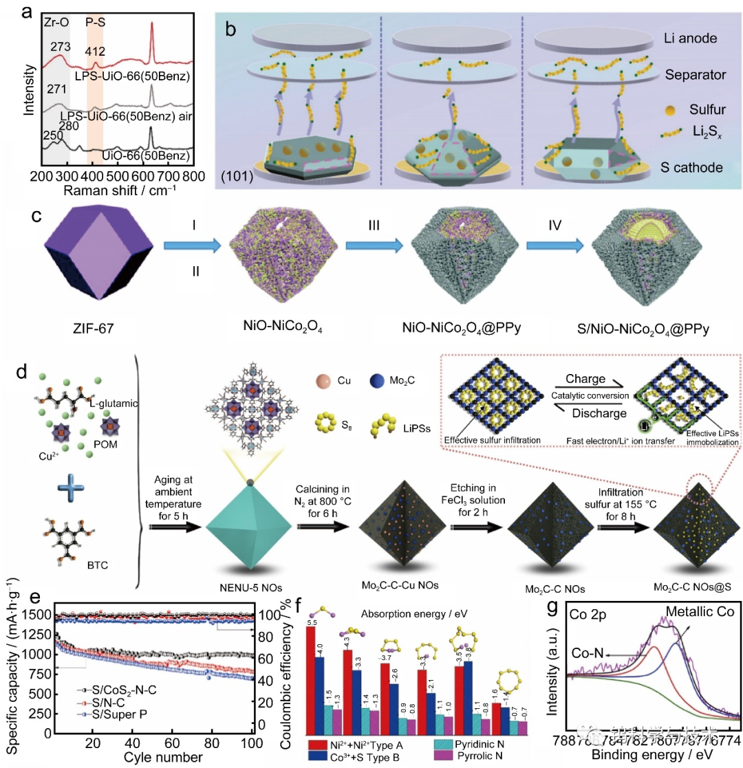 图4 a UiO-66和LPS-UiO-66的拉曼光谱;b 恒流充放电过程中硫的负载效果及与LiPS的相互作用图;c S/NiO-NiCo2O4@ppy的制备示意图;d Mo2C-C NOs@S复合材料制备示意图;e S/CoS2-NC、S/NC和S/super P电极在0.2 C下循环100次的循环性能;f NixCo3-xS4/N掺杂碳化物表面Li2Sn和S8物种的吸附能; g Co-N-C/CNTs的Co 2p XPS图谱。