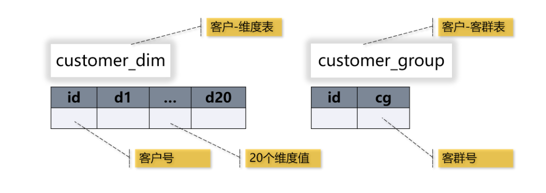 客户的每个维度的取值都是唯一的,每个客户一条记录即可存储,一亿个客户是一亿条记录。维度没有层次关系,维度的属性一般是几个到几十个。比如:性别的属性是两个,年龄段的属性是十几个。参与过滤的维度总数是十到二十个。一个客户平均属于10个客群,如果用数据库表来存储的话,客户-客群表就有十亿多条记录。表结构如下图:select count(*) from ( select count(g.cg) from customer_group g left join customer_dim d on g.id=d.id where g.cg in ('18','25') and d.d2 in ('2','4') and d.d4 in ('8','10','11') group by g.id having count(g.cg)=2)