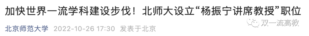 10月26日,北京师范大学宣布设立“杨振宁讲席教授”职位。在杨振宁的支持下,北师大物理学系联合物理学系校友捐赠设立“北京师范大学徐树彬魏清仙物理学人才基金”,每年出资100万元作为讲席教授特殊津贴,吸引高层次领军人才全职来校工作,加快世界一流物理学科建设步伐。![]()