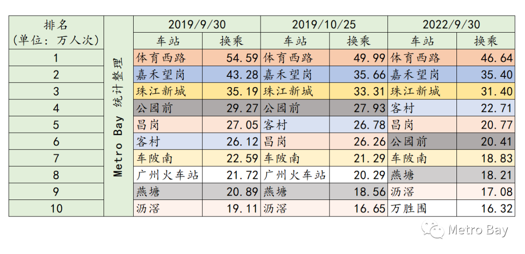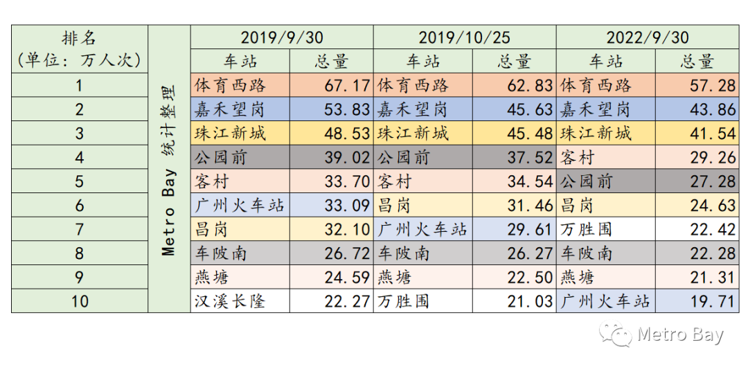 三个榜单的榜首都很稳定——进站为广州南站,换乘和总量为体育西路。总客流排行方面,前三以及第8、9名维持稳定,2022年排名下降的有公园前站、广州火车站,排名上升的有昌岗站、万胜围站、客村站,反映了广州城市重心的东移。而各项数据的绝对值方面,主要车站除万胜围站外皆有不同程度的下滑,且大多数跌幅超过全网跌幅,说明不少换乘车站还是得到了一定程度的分流。广州地铁线网客流逐步得以分散,客流强度和重点车站客流下降其实是好事,说明整体运力不足情况将逐步得到缓解。但近三年,广州地铁主力线路的下降除了自然分流,还有疫情压制的因素——疫情的反复改变了很多人的出行习惯,也给地铁客流造成了极大的流失。今后,希望大家能一如既往地日常做好个人防护,遵守防疫措施,勤洗手,戴口罩,做好自己健康的第一责任人。展望未来,Metro Bay期待疫情对于人们的心理影响和生理影响都能逐步下降,全网客流能逐渐恢复正常,大家能够有序地恢复流动。同时希望在2023年开始逐步开通的三期新线帮助下,重点车站的客流继续维持稳中有降的趋势,乘客能够获得更加友好的出行体验。广州地铁线网示意图官方版上新了!