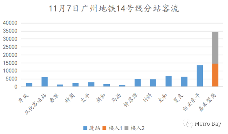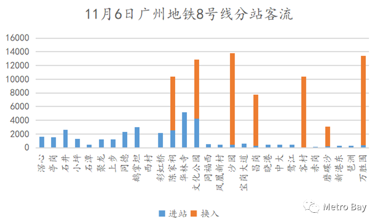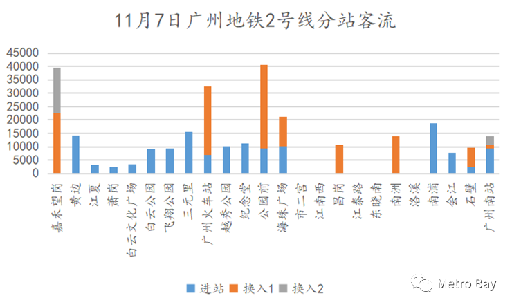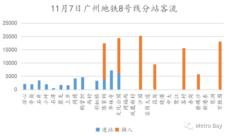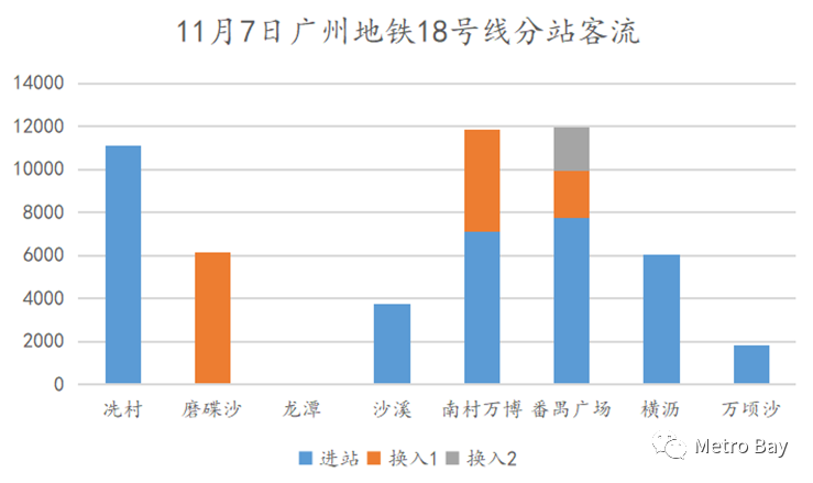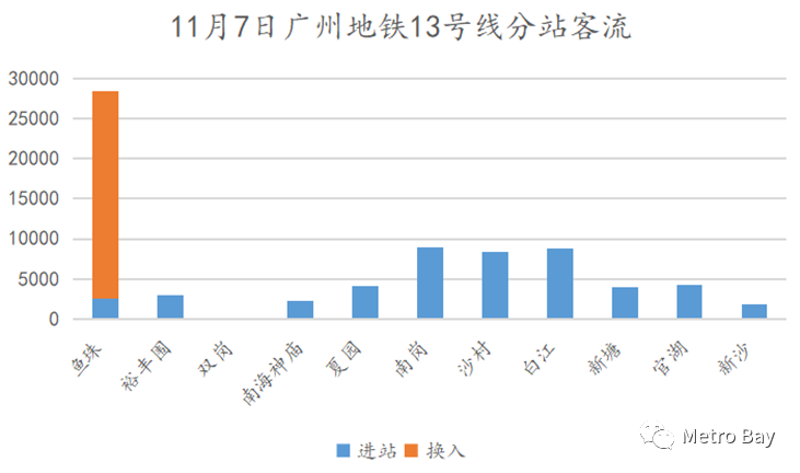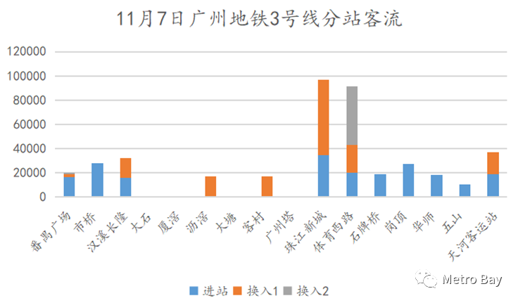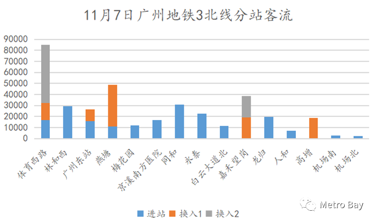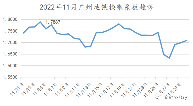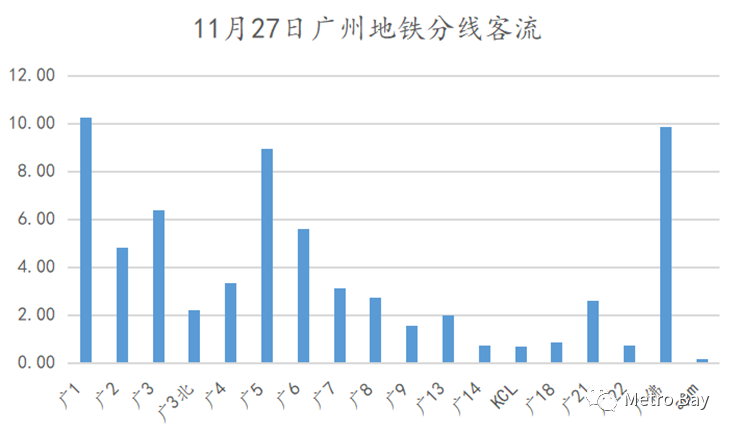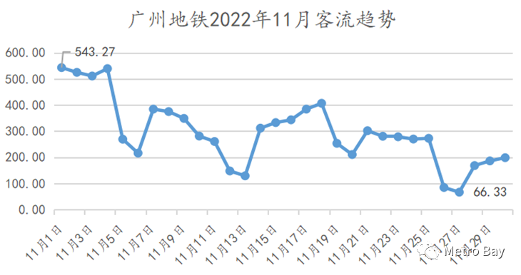 11月广州疫情达到三年最严重的状态,客流快速崩溃,甚至创下十余年新低。全月日均295.94w,较上月腰斩有余。其中工作日日均341.01w,休息日日均171.99w,均腰斩有余。全月最高为11月1日的543.27w人次,这个峰值为2020年3月以来最差水平。全月最低为11月27日的66.33w人次,为疫情最严重,封控面积最大的普通周日,创至少十年的新低。全月趋势上,月初大幅下跌,月中有过短暂的反扑,但随着白云、天河依次加入封站“群聊”,客流再度崩盘。月末虽白云解封,但番禺又封站,工作日压低到2020年2月水平。本月客流强度为0.4765,遭遇暴跌,全年第一正式宣告失守,依然说明体量相近的情况下,疫情影响为决定性因素。关于客流、拥挤度的事情,可以参见这篇科普文:本月换乘系数规律十分不稳定,封控面稍小时周末换乘系数仍和工作日相当,但封控面大时,虽换乘站都保留换乘功能,但换乘系数仍然快速下跌,并历史性地出现低于深圳的情况。月末工作日换乘系数在海珠、番禺、天河等大面积封控的情况下,工作日也不足1.7。受疫情影响,各线路客流都有巨大下跌。其中本月最低,也是近年新低的11月27日,分线客流如图所示:和平时客流量级大不相同的是,1号线因为完整运营而唯一留守在10w上方,广佛线佛山段也较完整,因此意外高居第二。5号线封站较少,仍居前三。而曾经的百万线-3北线和8号线,受大面积封站影响,客流低于4/7号线,和21号线相当。值得一提的是22号线,11月27日番禺未封站前仍有0.7w,占比竟超过全网1%,28-29日仅剩广州南站和番禺广场(仅开放换乘)后客流下降至800人上下,可谓凄凄惨惨戚戚。 首先是8号线:11月6日仍有成年高考,海珠区内三小时的运营时间内仍有一定的进站客流,但总客流已跌破10w。进站方面,华林寺夺得榜首,相邻的彩虹桥、陈家祠受影响更大些。沙园虽基本只剩广佛线换入客流,但仍居全线总量榜首。7日海珠区境内车站彻底关闭进出功能,但几根“光秃秃”的换乘客流仍然使得这几个站的客流排名前列,沙园继续居全线榜首(值得一提的是,在海珠全面封控前,10.31日客村只靠换乘客流也排进了全网客流前十)。华林寺以七千多的进站继续居进站榜首。受大规模封站影响,2号线客流降至不足30w,海珠段换乘客流也明显减少。但由于缺乏常态化进站数据,难以判断各车站基础量级,但核心段预计均腰斩有余。南浦站以1.8w+进站居当日进站第一,据此推断相对正常的时候,2号线核心段进站应普遍能达到2-4w。著名的“死亡3号线”来了!但很遗憾的是只能看到它落魄的样子-当日全线总量41w余(注:广州塔有APM“换入”1k人,但数据统计为进站,且因太少未显示)。但从有限的数据可以看出,3号线进站普遍十分扎实,所有开放车站进站皆过万,其中市桥进站量仅次于珠江新城居本线第二,可见强大通勤客流。此外可以注意到,未来10号线区段客流为11.23w,考虑疫情压制,该区段正常状态下应有20w以上-以后10号线全线贯通后的基本盘来源,但全线贯通想达到广州地铁预测的76w,恐怕是难度极大。3北线仅嘉禾望岗站受影响,总客流仍有37w余-约为常态一半。其中机场两站损失极大,总进站仅约6k,而疫情前的2019可达7w,仅剩其零头。高增几乎只有换乘客流,所以在9号线开通之前一直飞站也算合情合理。进站最扎实的为林和西和同和,一个位于CBD加上有APM换入客流,另一个为大型居住区。 此外观察体育西路站客流-3北和3主之间的交换总量约为10w(换入量各5w),在海珠正常运营时估计能超过20w乃至25w。而3号线体育西以南主线到10号线拆解段的客流究竟有多少则暂时不得而知,但从进站量来看,应少于3北-3主的交换量的一半。换言之,10号线全线贯通后,可能会有10-20w的客流因为计算方式改变而“消失”,换乘系数也可能会迎来小幅下降。4号线仅万胜围封站,其余车站相对影响较小。但由于4号线许多乘客可能原本都前往海珠方向(万胜围2021年日客流为16.1w),该站客流较以往锐减八成。进站方面,主力仍然集中在海傍以北,尤其车陂站以2.3w居榜首。大学城两站应也受到大学逐步封校影响,客流下滑应较大。从客流分布来看,预计3号线东延段开通后,3/4号线的换乘客流应仍不会太多,给线网提供1-2w的增量已是不错。13号线当日双岗站关闭,其余车站客流量级与常态水平下降约3成,但鱼珠、南海神庙下降较少-可能是附近居民通过另一个车站或公交接驳所致。14号线主线嘉禾望岗站封闭,客流腰斩。但嘉禾望岗本来换入客流就是数倍于进站客流,因此关闭进出站对它进一步影响不大,主要仍是全网大幅下降所致。此外新和站较常态下跌幅度最大,原因不明。18号线封站2个,总客流掉到5w余,其它几个车站较常态化普遍也有3成下降。