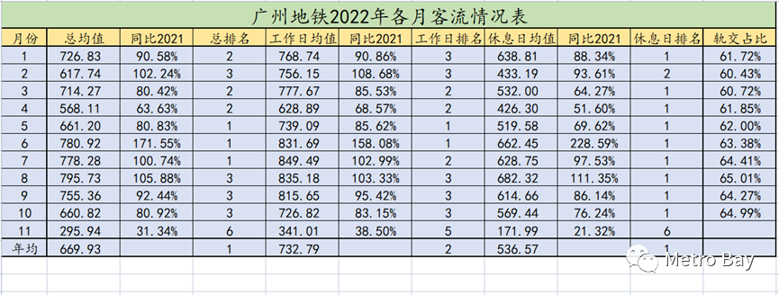 此外广佛线也受到封站影响,但考虑到其佛山市内车站较多,因此将该线路分站客流放入佛莞客流月报部分。2022年10月广州市轨交的分担率为64.99%,居历史第二,主要应是较正常的国庆假期做的贡献。11月受疫情影响,公交地铁都停运,轨交占比变化方向尚未可知,但出现异动的可能性会很大。