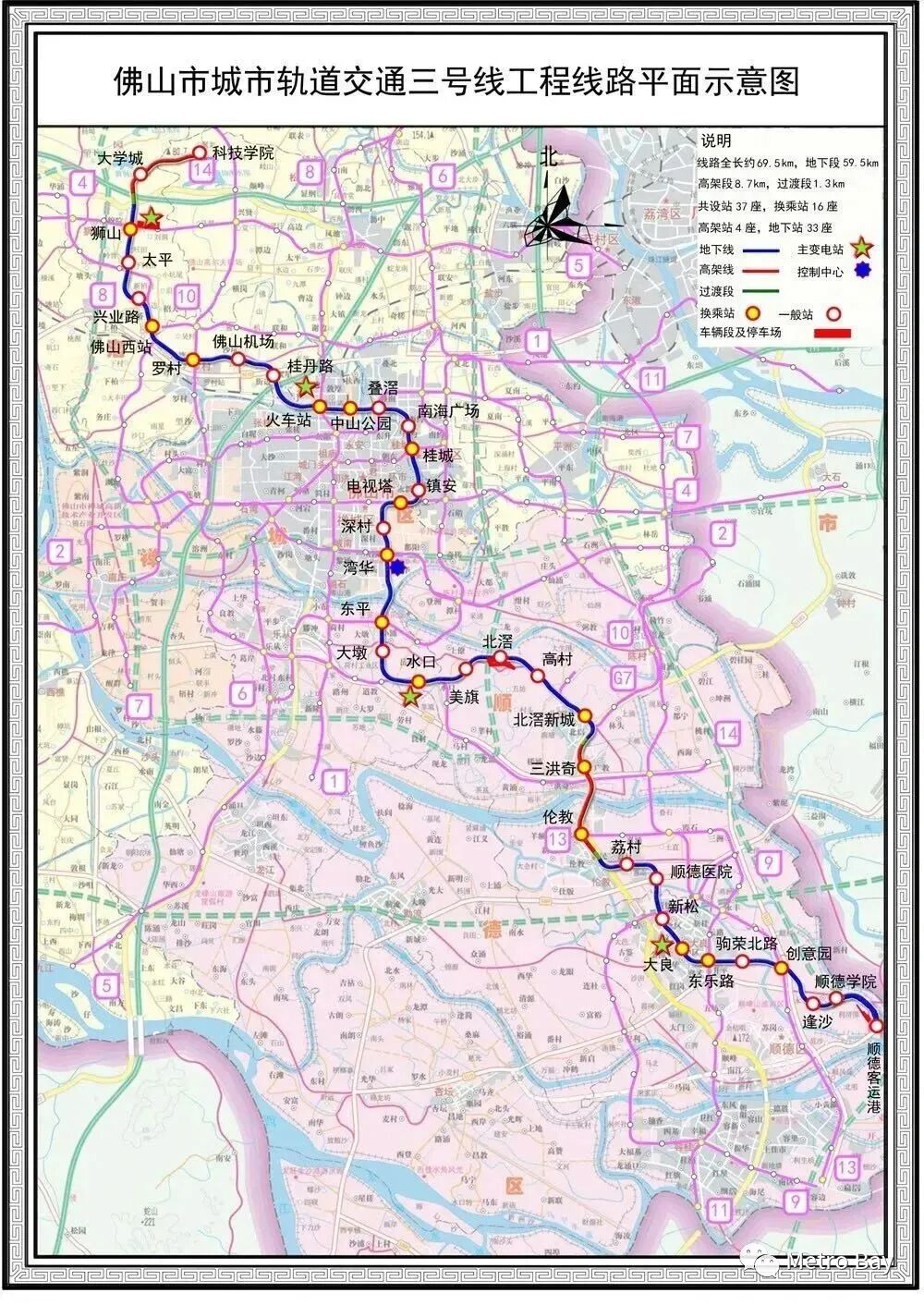 《佛山市城市轨道交通三号线工程可行性研究调整报告》获广东省发改委批复。调整后的3号线项目,南起顺德客运港站,北至科技学院站,全长约69.5km,较原批复减少1.8km;设车站37座,较原批复增加1座,取消原批复的容桂、桂州大道、容山、德胜4座车站,新增顺德客运港、顺德学院、驹荣北、大学城、科技学院5座车站。
