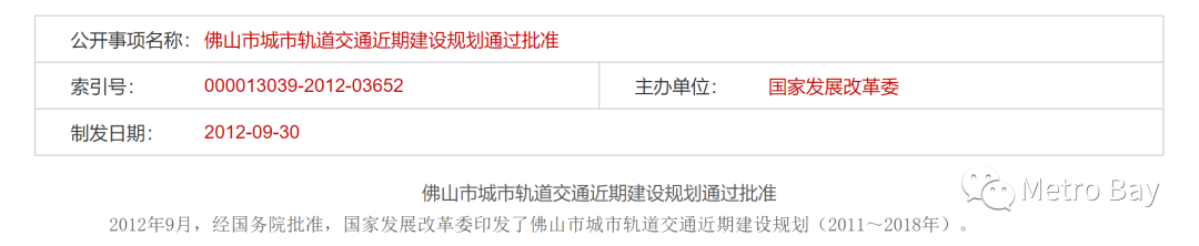 国家发展改革委印发了《佛山市城市轨道交通近期建设规划(2011~2018年)》。3号线工程(容桂站~狮山站,线路长约70.2km,设站34座)被纳入近期建设方案,规划建设期为2011年~2016年。