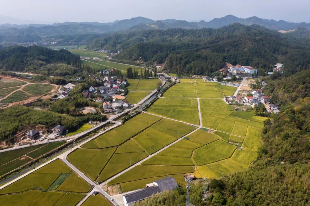 空中俯瞰杭州市临安区太阳镇太阳米稻田基地。图源:新华社