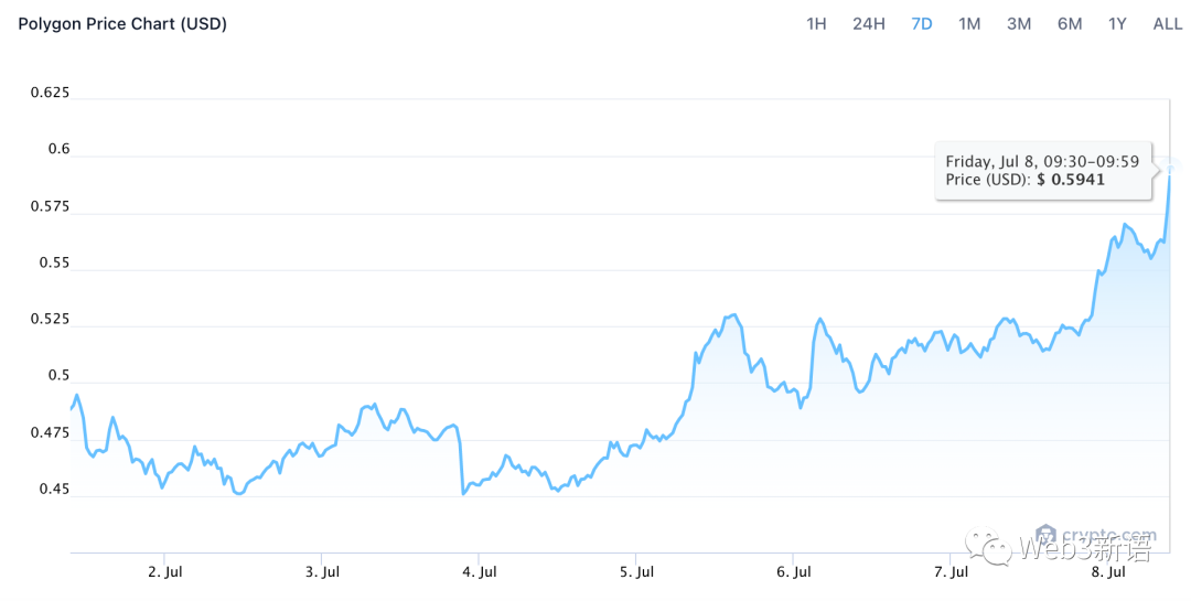 截止7月8日,MATIC价格为0.58美元,总交易数18亿+,手续费44.1Gwei(低于0.01美元),代币总供应量为100 亿枚,流通量近80亿枚,流通市值约46亿美元。