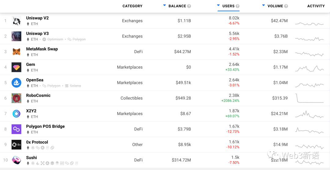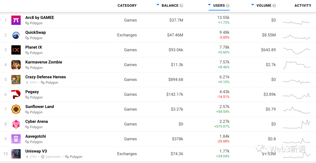 另外,从两者Dapp前十名的活跃用户数量看,Polygon的日活用户整体高于以太坊,这也不失为Polygon受欢迎的一个表现。