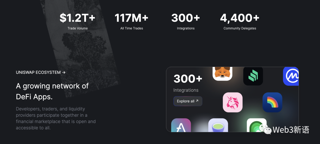 从其最新发布的官方博客《将 Web3 带给所有人》中获知, Uniswap 经社区投票创建了基金会,将为去中心化协议发展做出贡献,并在未来几年向社区项目提供至少 6000 万美元的赠款。Uniswap 既是一个优秀的去中心化应用(DAPP)也是一个协议,基于此可以创造出更多的新的DAPP,或许在未来 Uniswap 生态与不同应用场景相结合,百花齐放更是智能合约应用的美妙之处。