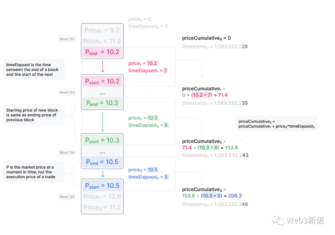 Uniswap V2会在交易发起之前,通过预言机测量代币对在区块开始时的市场价格,而市场价格则会锚定前一个区块中的最后一笔成交价。如果攻击者试图操纵价格,需要前一个区块完成最后一笔交易,并连续挖出两个区块,且期间没有套利者参与,否则无法确保获利,这大幅提升了价格操纵的难度。但也让价格变动出现了一定延迟,不能保证完全与市场价同步。