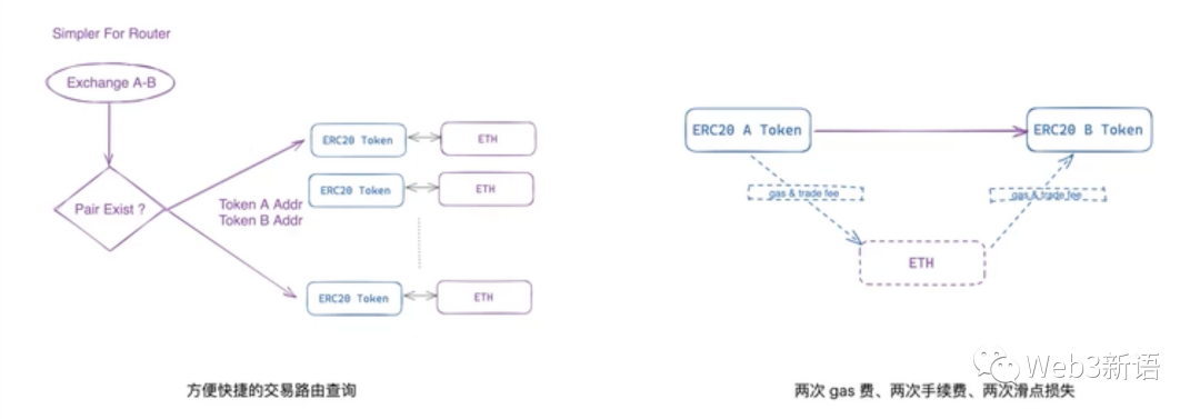 V2提出了自由组合交易对的规则,用户可以组建ERC-20代币的流动性池,代币兑换时不再需要ETH作为中转代币做中转。移除此限制后进行币币兑换可减少一半的交易次数,节省了Gas费,也能削弱因两次交易带来的滑点损失,交易的便捷性大幅提升。