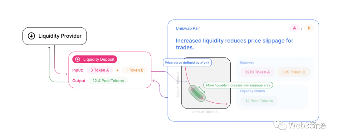 Uniswap的AMM机制是将所有人的资产汇集到资金池中,并根据“恒定乘积做市商模型(CPMM)”的算法进行做市商。所谓的“恒定乘积”其实可以看成一个反比例函数“x·y=k”,无论x和y怎么改变,k始终是一个定值。放到Uniswap的交易中是指某次交易前后流动池里的两种代币数量的乘积是恒定的,即买前乘积=买后乘积。这个简单的反比例函数,是独角兽的骨架构图。这样一来,用户就可以根据这个规则在以太坊上进行资金兑换了。