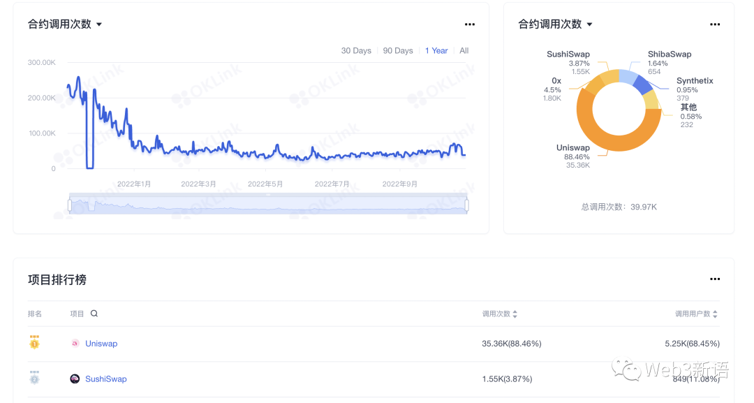截至目前,在通过 Uniswap 的交易量已高达1.2T,完成了1.16亿笔交易,如果对这个数字没什么概念,那么在过去三年里Uniswap作为去中心化自动做市交易协议在以太坊上的合约调用次数稳占半壁江山,足可以说明其不可撼动的江湖地位了。