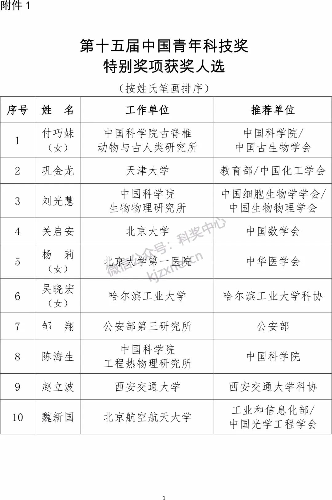 在中国青年科技奖领导工作委员会领导下,经初评、复评、终评,共产生100名第十五届中国青年科技奖获奖人选。其中,10名为第十五届中国青年科技奖特别奖项获奖人选。