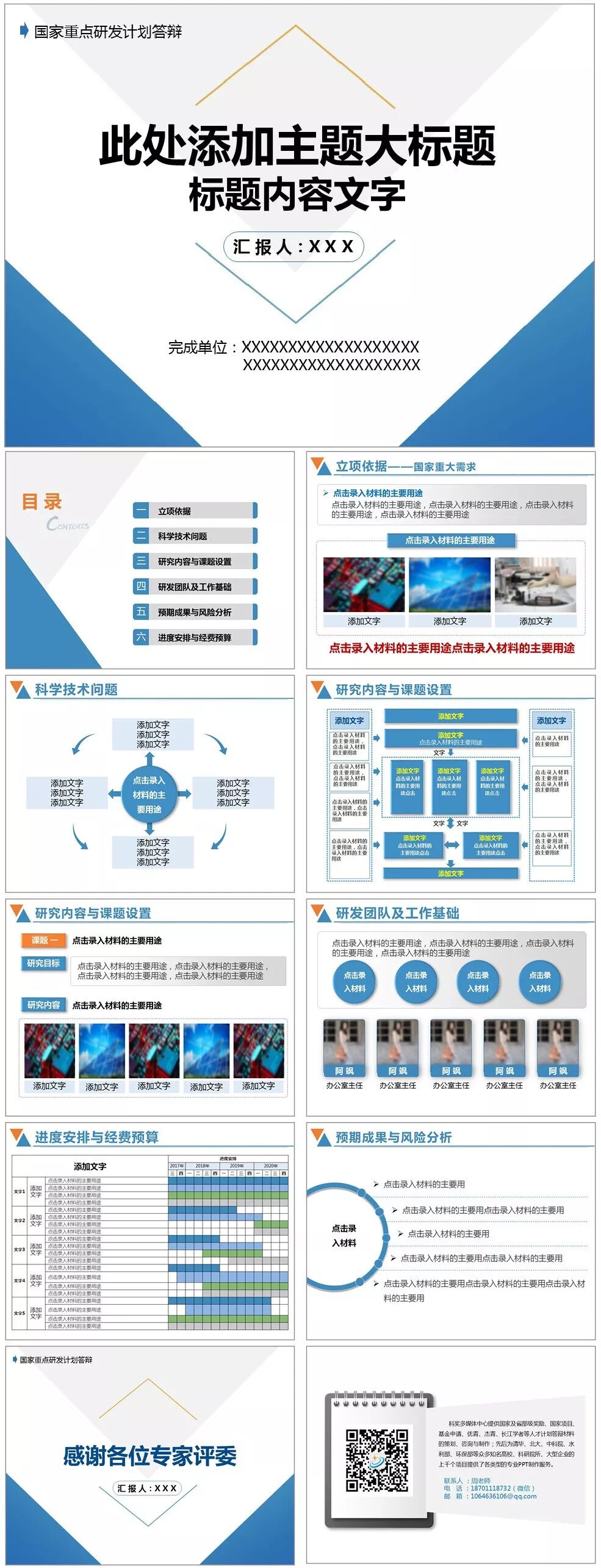 模板说明:本模板采用亮蓝色调,通用于重点研发、重大项目等人才答辩,稍显活力,模板通用!内页设定为重点研发常用目录,全部内容可自行修改。