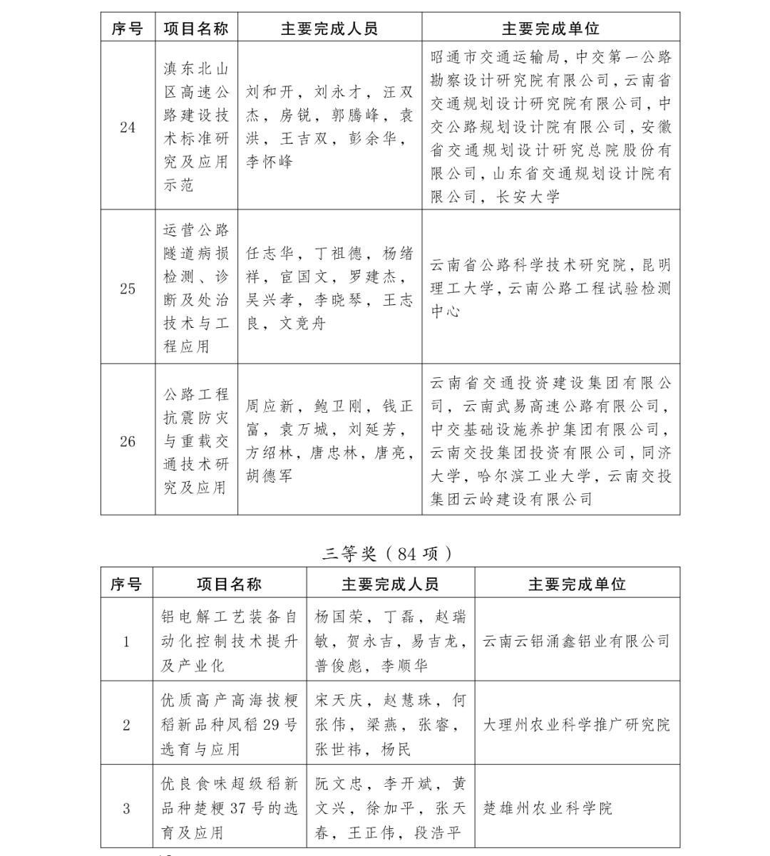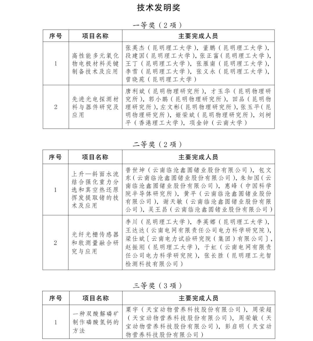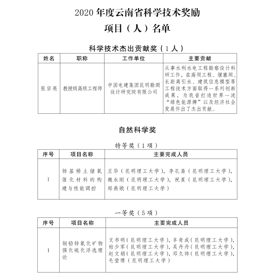 根据《云南省科学技术奖励办法》(云南省人民政府令第157号)规定,经组织专家评审、省科学技术奖励委员会审定,省人民政府批准,授予张宗亮云南省科学技术杰出贡献奖;授予“铈基稀土储氧催化材料的构建与性能调控”成果云南省自然科学奖特等奖,授予“铜铅锌氧化矿物强化硫化浮选理论”等5项成果云南省自然科学奖一等奖,授予“晚古生代至早中生代植物古生态学研究”等12项成果云南省自然科学奖二等奖,授予“新型电化学界面的构筑及其在储能电池上应用研究”等21项成果云南省自然科学奖三等奖;授予“高性能多元氧化物电极材料关键制备技术及应用”等2项成果云南省技术发明奖一等奖,授予“上升—斜面水流结合强化重力分选和真空热还原挥发提取锗的技术及应用”等2项成果云南省技术发明奖二等奖,授予“一种双酸解磷矿制作磷酸氢钙的方法”等3项成果云南省技术发明奖三等奖;授予“低纬高原花卉绿色高效生产关键技术与应用”等3项成果云南省科学技术进步奖特等奖,授予“国五/国六汽车催化剂关键技术及产业化”等13项成果云南省科学技术进步奖一等奖,授予“云木香等三种云南高山道地药材绿色高效生产技术体系构建及应用”等26项成果云南省科学技术进步奖二等奖,授予“铝电解工艺装备自动化控制技术提升及产业化”等84项成果云南省科学技术进步奖三等奖;授予安东尼奥·皮兹等2人云南省科学技术合作奖。