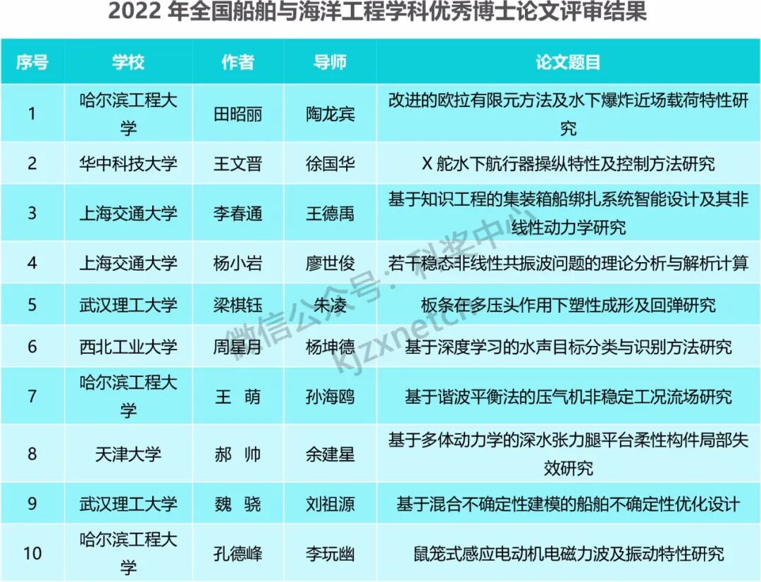 2022年全国船舶与海洋工程学科优秀博士论文评审结果公示
