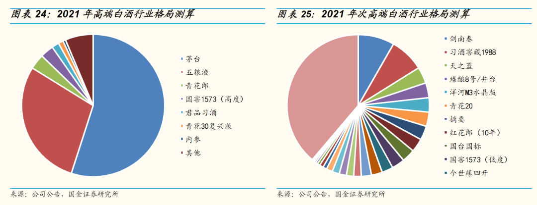国金证券分析师刘宸倩8月29日发布的研报中显示,2021年高端白酒行业茅台市占率最高,五粮液、青花郎次之;次高端白酒行业剑南春占据首位,习酒窖藏1988和天之蓝次之。