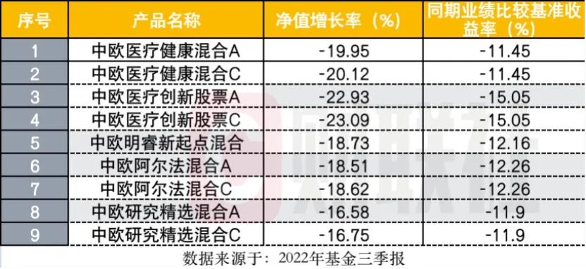中欧明睿新起点混合的基金份额净值增长率为-18.73%,同期业绩比较基准收益率为-12.16%;中欧阿尔法混合A类、C类份额净值增长率为-18.51%、-18.62%,同期业绩比较基准收益率为-12.26%;中欧研究精选混合A类、C类份额净值增长率分别为-16.58%、-16.75%,同期业绩比较基准收益率为-11.90%。
