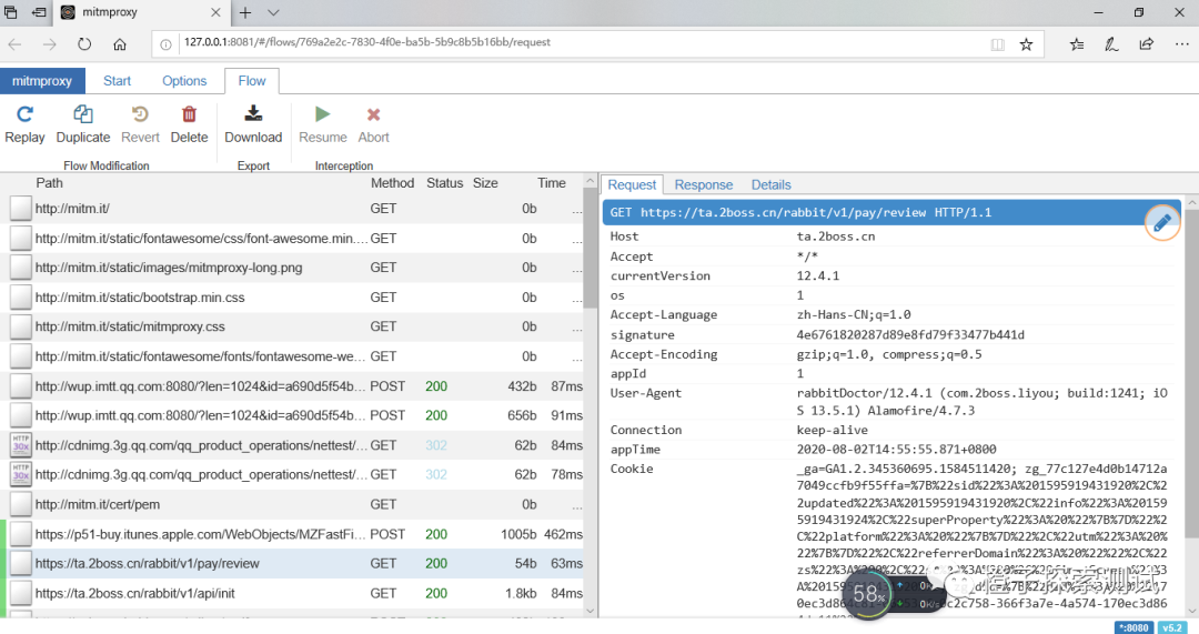 设置好后,进入app进行抓包,这时去mitmproxy web页,已经抓到app接口数据了