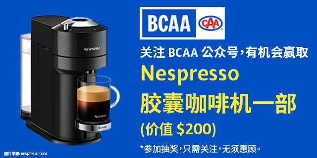 错过了上一轮大赠送活动的伙伴们,现在机会又来了!只要在 2022 年 6 月 6 日晚上 11 时 59 分 (太平洋时间) 前关注 BCAA 微信公众号,即可自动加入抽奖名单,有机会赢取价值 $200 的 Nespresso 胶囊咖啡机一部!