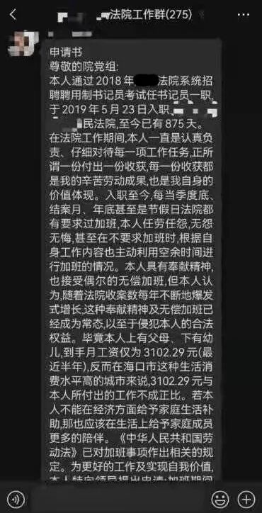 本人通过2018年海南法院系统招聘聘用制书记员考试任书记员一职,于2019年5月23日入职XX人民法院,至今已有875天。在法院工作期间,本人一直是认真负责、仔细对待每一项工作任务,正所谓一份付出一份收获,每一份收获都是我的辛苦劳动成果,也是我自身的价值体现。入职至今,每当季度底、结案月、年底甚至是节假日法院都有要求过加班,本人任劳任怨,无怨无悔,甚至在不要求加班时,根据自身工作内容也主动利用空余时间进行加班的情况。本人具有奉献精神,也接受偶尔的无偿加班,但本人认为,随着法院收案数每年不断地爆发式增长,这种奉献精神及无偿加班已经成为常态,以至于侵犯本人的合法权益。毕竟本人上有父母、下有幼儿,到手月工资仅为3102.29元(最近半年),反而在海口市这种生活消费水平高的城市来说,3102.29元与本人所付出的工作不成正比。若本人不能在经济方面给予家庭生活补助,那也应该在生活上给予家庭成员更多的陪伴。《中华人民共和国劳动法》已对加班事项作出相关的规定。为更好的工作及实现自我价值,本人特向领导提出申请:加班期间给予加班补助或在2022年给予调休。希望领导慎重考虑本人的申请,并给予答复。在院党组给予明确各复前,本人拒绝无偿加班。