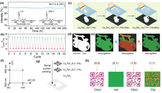 此外,该材料还具备超高的光热稳定性与良好的可逆性能。通过联合使用具有不同掺杂成分的材料,可实现多维信息加密的应用。
