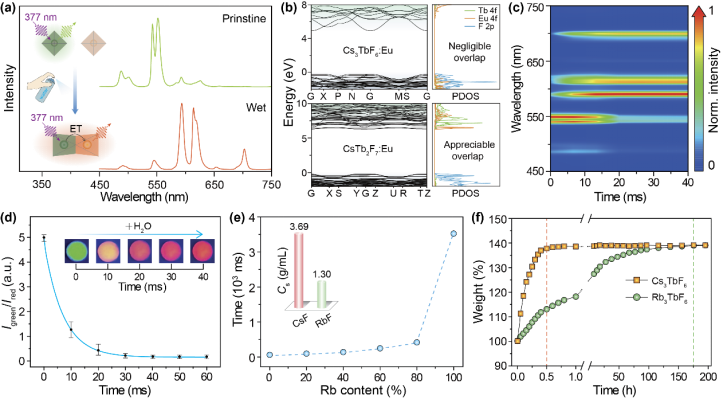 在相同波长激发下,该材料在遇水前后的发光颜色发生了明显的变化,并且变色速度快(约20毫秒)。机理研究表明相变是由于CsF的超高水溶性导致了其在遇水之后被水从晶体中剥离出来,从而引起了相变。