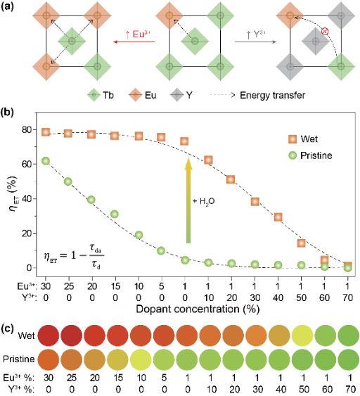 离子掺杂,可逐渐拉长两个发光中心的距离,进而可控地调节相变后的发光从橙色到绿色的变化。