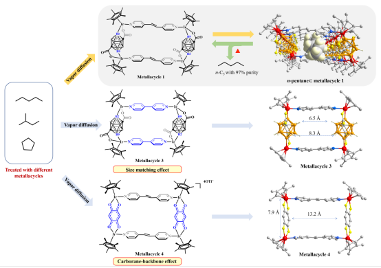 复旦大学金国新课题组设计了含碳硼烷骨架的矩形有机金属环状化合物,可选择性地从正戊烷、异戊烷和环戊烷三组分混合物中分离出正戊烷,纯度可达97%。