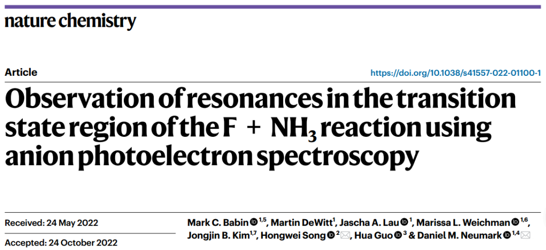北京时间2022年12月13日,中国科学院精密测量科学与技术创新研究院宋宏伟副研究员、美国新墨西哥大学郭华教授与加利福尼亚大学伯克利分校Daniel M. Neumark教授团队合作在Nature Chemistry期刊上发表了题为“Observation of resonances in the transition state region of the F + NH3 reaction using anion photoelectron spectroscopy”的研究成果。