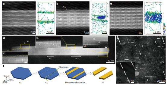 。APT结果显示,Ω和V纳米沉淀物之间的唯一区别是Sc原子均匀地分布在V相内(图1d与图1e相比)。