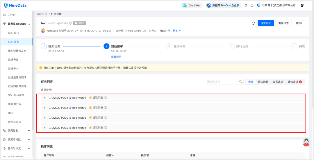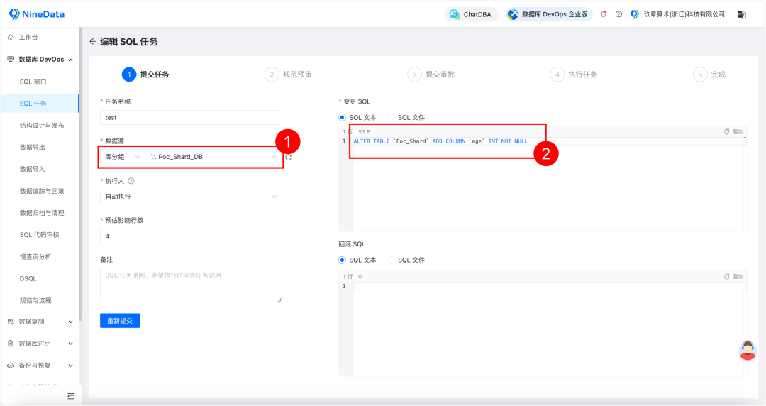 通过 NineData 的 SQL 任务功能,对库分组发起变更申请,经过系统(规范预审)和审批人员的双重审批后,DDL 语句将会在库分组中的所有分库中执行。