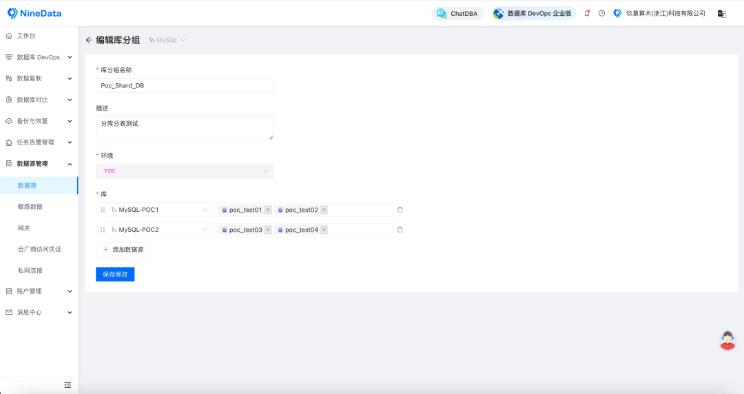 在 NineData 的数据库 DevOps 专业版以上版本中,支持库分组的创建,可以将不同数据源中的库添加到该库分组中,用来进行统一的变更与查询。