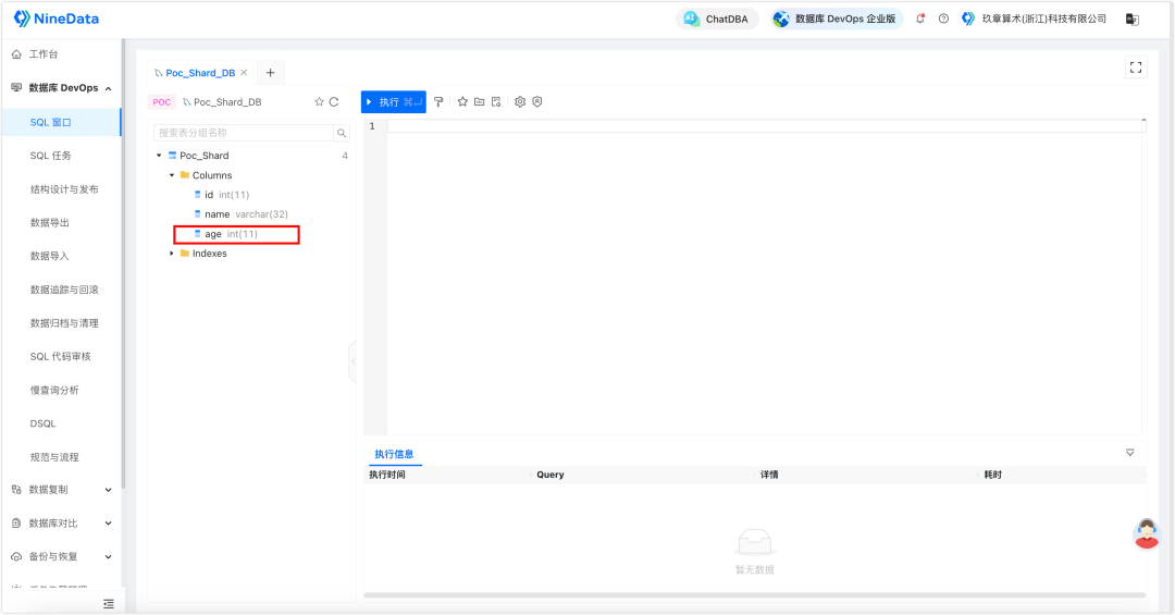 1. 提交 SQL 任务,选择库分组,输入 DDL 语句。本示例给 Poc_Shard_DB 库分组增加一个 age 列。