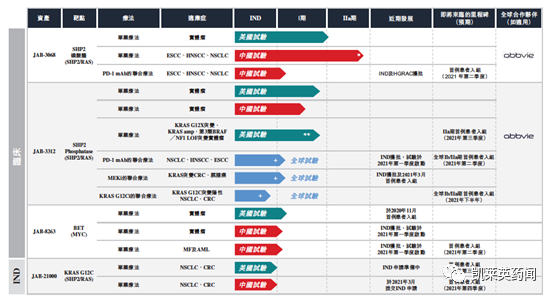 加科思与艾伯维在2020年5月签署合作协议,双方将共同开发加科思自主研发的小分子抗肿瘤药SHP2抑制剂(包括JAB-3068和JAB-3312),目前正在全球三十多个临床中心展开SHP2抑制剂单药及联合用药试验。此前,加科思宣布,JAB-3312已分别完成与PD-1抗体派姆单抗(Pembrolizumab)以及MEK抑制剂比美替尼(Binimetinib)用药临床试验的首例患者给药。加科思是一家致力于原始创新及难成药靶点的抗肿瘤新药研究的公司,是全球SHP2研发的领先者之一,专长于SHP2/RAS、MYC、RB、免疫检查点和肿瘤代谢五大肿瘤细胞信号通路的肿瘤新药研究,其中JAB-3312在同类产品中有最强的活性,已有4个新药在中美进入临床I-II期阶段,共14个临床研究在开展中。