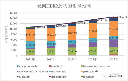 (一)小分子抑制剂1、afatinib(阿法替尼)阿法替尼是由Boehringer Ingelheim开发的一种口服的、不可逆的、ERBB家族受体阻滞剂,能够阻断 HER1、HER2、HER4的信号,从而达到关闭肿瘤细胞信号传导通路、抑制肿瘤生长的目的。作为第二代酪氨酸激酶抑制剂中首个获批的不可逆ERBB家族受体阻断剂,LUX-Lung 3研究用于EGFR突变的IIIb期或IV期NSCLC患者的结果显示,相较标准化疗,阿法替尼可显著延缓疾病进展;LUX-Lung 6研究用于EGFR突变阳性的晚期肺腺癌亚洲患者的结果显示,与化疗组相比,阿法替尼组的中位无进展生存期(PFS)明显延长(11个月 vs 5.6个月);此外,阿法替尼组的客观反应率(66.9% vs 23%)、疾病控制率(92.6% vs 76.2%)均较高在所有晚期肺腺癌亚洲患者中,阿法替尼组与化疗组的药物相关不良反应(≥ G3)分别为36%、60.2%。2、pyrotinib(吡咯替尼)Pyrotinib是由恒瑞医药开发的一种不可逆的泛ErbB受体酪氨酸激酶抑制剂,可同时作用于HER1、HER2、HER4,这也是中国实体肿瘤中第一个基于II期的临床研究结果批准上市的抗肿瘤药物。在pyrotinib的注册II期临床试验中,Pyrotinib联合卡培他滨治疗晚期乳腺癌的中位PFS长达18.1个月。2021年8月,《临床癌症研究》期刊公布了一项真实世界、多中心研究的探索性最终分析数据,旨在评估吡咯替尼治疗HER2阳性转移性乳腺癌和脑转移患者的疗效,结果显示,中位随访时间为18.5个月,整个队列的中位PFS为8个月,总生存期(OS)为19.07个月;其中,激素受体(HR)阳性患者的OS为22.33个月,而HR阴性患者的OS为14.52个月。此外,脑转移患者vs非脑转移患者的PFS为8.67个月vs 8个月,OS为13.93个月vs 20.93个月。 3、mobocertinibMobocertinib是由武田开发的一种能够有针对性地靶向作用于EGFR和HER2 20号外显子插入突变的强效小分子酪氨酸激酶抑制剂。2020年4月,美国FDA授予了mobocertinib突破性药物资格,用于治疗接受含铂化疗期间或之后病情进展、携带EGFR第20号外显子插入突变的转移性非小细胞肺癌患者。临床结果显示,mobocertinib在既往接受过含铂化疗的EGFR 20号外显子插入突变的NSCLC患者中显示了具有临床意义的缓解,且缓解持续时间可长达17.5个月 [2]。(二)单克隆抗体1、曲妥珠单抗曲妥珠单抗是由罗氏开发的全球第一款HER2单克隆抗体,一经上市便取得巨大的成功,这也是目前临床上针对HER2阳性乳腺癌最常用的药物。它通过直接与癌细胞表面的HER2相结合,激活淋巴细胞释放细胞毒性物质,促使癌细胞凋亡。2021年7月,英国《柳叶刀》在线发表早期乳腺癌试验者协作组(EBCTCG)研究报告[3],对7项随机对照试验13864例早期HER2阳性乳腺癌女性接受曲妥珠单抗辅助治疗的长期获益和风险进行了荟萃分析。研究结果表明,对于早期HER2阳性乳腺癌,曲妥珠单抗+化疗与单用化疗相比,无论记录在案的患者特征和肿瘤特征如何,乳腺癌复发率和乳腺癌死亡率可减少三分之一。2、帕妥珠单抗帕妥珠单抗是由罗氏在2012年研发上市的靶向Her2的单抗药物,和曲妥珠单抗与Her2蛋白的结合位点不同。帕妥珠单抗是跟Her2蛋白的CR1区域结合,可以阻止Her2与其他Her受体形成异源二聚体,阻断了Her2信号通路。帕妥珠单抗+曲妥珠单抗联合使用则可以充分阻断Her2信号通路,起到协同增效的作用。帕妥珠单抗在HER2阳性晚期乳腺癌一线治疗中的获批主要是基于持续长达8年随访的CLEOPATRA研究和来自中国人群的PUFFIN研究的两项研究结果,CLEOPATRA研究显示帕妥珠单抗+曲妥珠单抗联合多西他赛可以使HER2阳性晚期乳腺癌患者的PFS延长51%,达到18.7个月,患者OS延长40%,生存期可延长至近5年;PUFFIN研究是CLEOPATRA的桥接研究,显示帕妥珠单抗联合曲妥珠单抗双靶组较对照组患者的复发和死亡风险降低了31%,中位PFS为14.5个月,对照组为12.4个月。3、margetuximabMargetuximab由Incyte和MacroGenics开发,再鼎医药获得在大中华区的独家开发与推广许可。Margetuximab与曲妥珠单抗具有相似的HER2结合和抗增殖作用,通过对抗体Fc端进行工程化改造,增强了它激发抗体依赖性细胞介导的细胞毒性。在2021 ESMO大会上,MacroGenics公司公布了其与抗PD-1抗体联用,一线治疗HER2阳性,PD-L1阳性的胃食管腺癌(GEA)患者的临床结果,显示截至2021年7月19日,在40名可以评估疗效的患者中,21名获得缓解(53%,95% CI,36%-69%)。在接受过至少一次病灶扫描的41名患者中,32名患者的肿瘤缩小(78%);患者的疾病控制率为73%,中位缓解持续时间为10.3个月,中位无进展生存期为6.4个月;在12和18个月时,总生存率为85%;它具有成为一线治疗HER2阳性胃癌患者的潜力。(三)双特异性抗体1、zanidatamabZanidatamab是Zymeworks开发的一种双特异性抗体,百济神州拥有在亚洲(日本除外)、澳大利亚和新西兰的开发和推广的独家授权。2020年12月,美国FDA已授予zanidatamab突破性疗法认定,用于治疗HER2基因扩增的经治胆道癌(BTC)患者。它通过与HER的两个非重叠表位结合,产生多种作用机制,包括双重HER2信号阻断、增加HER2蛋白从细胞表面的清除,以及提高抗体介导的细胞毒性作用,从而提高抗癌活性。在2021 ESMO上报告的最新结果显示,zanidatamab与化疗联用,在28名可以评估疗效的HER2阳性转移性胃食管腺癌患者中,达到75%的客观缓解率(ORR)和89%的疾病控制率。在28名患者中,只有1名患者的肿瘤没有缩小;中位缓解持续时间为16.4个月,中位无进展生存期为12.0个月;预计在今年第四季度启动全球性3期临床试验。2、KN-026KN-026是康宁杰瑞自主开发的一款抗HER2双特异性抗