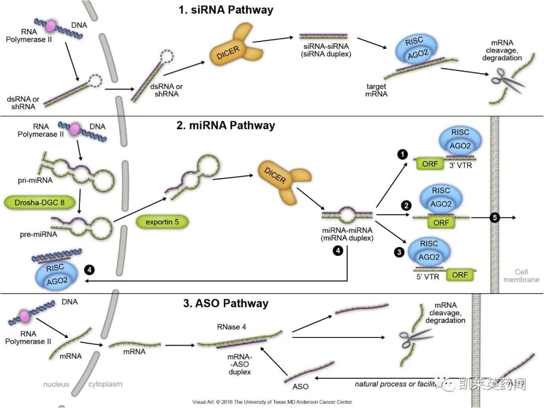 小核酸药物是指能利用siRNA 、miRNA及反义核酸(ASO)等核酸小分子特异性地沉默疾病基因的表达,以治愈特定疾病的药物。小核酸药物主要分为siRNA 、miRNA 、ASO、小激活RNA(saRNA)、核酸适配体(aptamer)、转运RNA(tRNA)碎片、抗体核酸偶联药物(ARC)等。其中siRNA 是指双链RNA或发卡结构RNA 经核酸内切酶剪切后形成,在解旋酶作用下生成正义链和反义链,并形成RNA 诱导沉默复合体RISC,RISC将靶基因的mRNA 切割降解, 从而抑制靶基因的表达;siRNA药物主要通过RNAi 机制对靶基因进行调控。miRNA 是指前体miRNA 被转运到细胞质中, 核酸内切酶将其剪切成约为20-24 bp 的miRNA 双链。随后被载入RISC 中,一条单链miRNA 被降解,另一条成熟的单链miRNA 分子与靶mRNA 序列互补配对,调节基因的表达。ASO是指其mRNA 或其它RNA 互补的DNA 或RNA 分子,可以与mRNA 或者Pre-mRNA特异性的互补结合,抑制该mRNA 的翻译或引起mRNA 的降解,调节蛋白的表达及细胞的生长、分化等,从而起到治疗疾病的作用。Aptamer 是人工合成的短单链DNA或者RNA序列,其通过自身的三维构型与其标靶,如蛋白质、细胞、病毒等实现特异性结合。