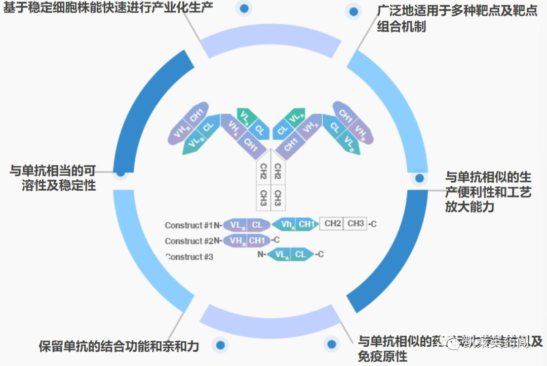 岸迈生物开发的FIT-Ig平台,是一类四价对称性双特异抗体技术,不需要额外设计氨基酸突变,也不包含连接肽链及任何非抗体序列的双特异性抗体技术。原抗体的2个Fab 区以交叉方向直接串联融合,当在哺乳动物细胞中表达时,构建3 个片段完成正确组装。由于采用对称结构,不存在重链错配问题。目前,基于该平台研发的EGFR×cMET 双抗EMB-01 已经在中美都进入II 期临床阶段。凭借双抗相关技术,公司信达生物、特瑞思也达成多个合作协议。