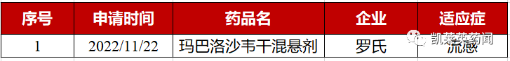 2022年11月22日,罗氏的玛巴洛沙韦干混悬剂的新药上市申请(NDA)已获CDE受理,用于治疗流感。玛巴洛沙韦由日本盐野义和罗氏合作研发,通过抑制流感病毒中的cap依赖型核酸内切酶,抑制病毒复制;此外,该药物还能够对奥司他韦产生耐药性的病毒株和禽流感病毒株(H7N9,H5N1)起作用。玛巴洛沙韦于2018年2月在日本率先获批,同年10月获 FDA批准上市,2021年4月玛巴洛沙韦片已经在中国获批上市。相较于片剂剂型,口服混悬剂可能为儿童和吞咽困难的人提供更方便的治疗选择。在一项3期、多中心随机miniSTONE-2研究中,公司评估了玛巴洛沙韦干混悬剂与奥司他韦在1~12岁以下健康流感儿童中的安全性、药代动力学和疗效。结果显示,玛巴洛沙韦干混悬剂和奥司他韦缓解流感体征和症状的时间相当,患者症状和体征缓解的中位时间分别为138小时和150小时。在安全性上,药物耐受性良好,没有发现新的安全性信号。