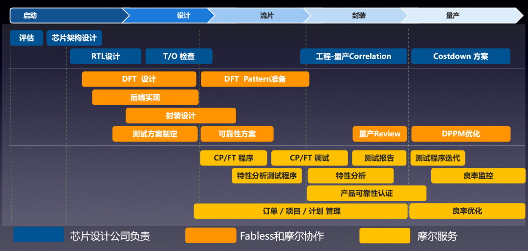 从项目启动 - 设计- 流片 - 封装 - 直到最终量产,摩尔精英提供完整的供应链Turn-key解决方案。让芯片设计公司专注在芯片的产品定义、架构设计等核心技术与市场销售等核心渠道;摩尔精英协助Fabless完成中后端的芯片设计、封装设计、测试开发、流片封装等环节,帮助客户从“图纸”变成“产品”,并通过完整的供应链服务团队,帮助客户实现量产,解决供应量中效率、品质、成本、流程等一系列问题,助力客户的芯片产品Design Win。