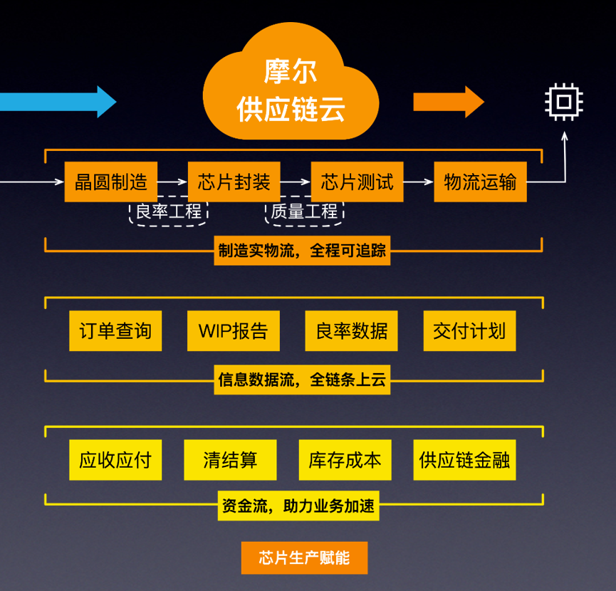芯片设计云为客户提供从芯片定义到产品的Turnkey全流程设计服务和IT/CAD及云计算服务;供应链云为客户提供一站式晶圆流片、封装、测试、产品工程及量产管理服务;人才云为行业培养输送专业人才并助力IC人才终生学习。