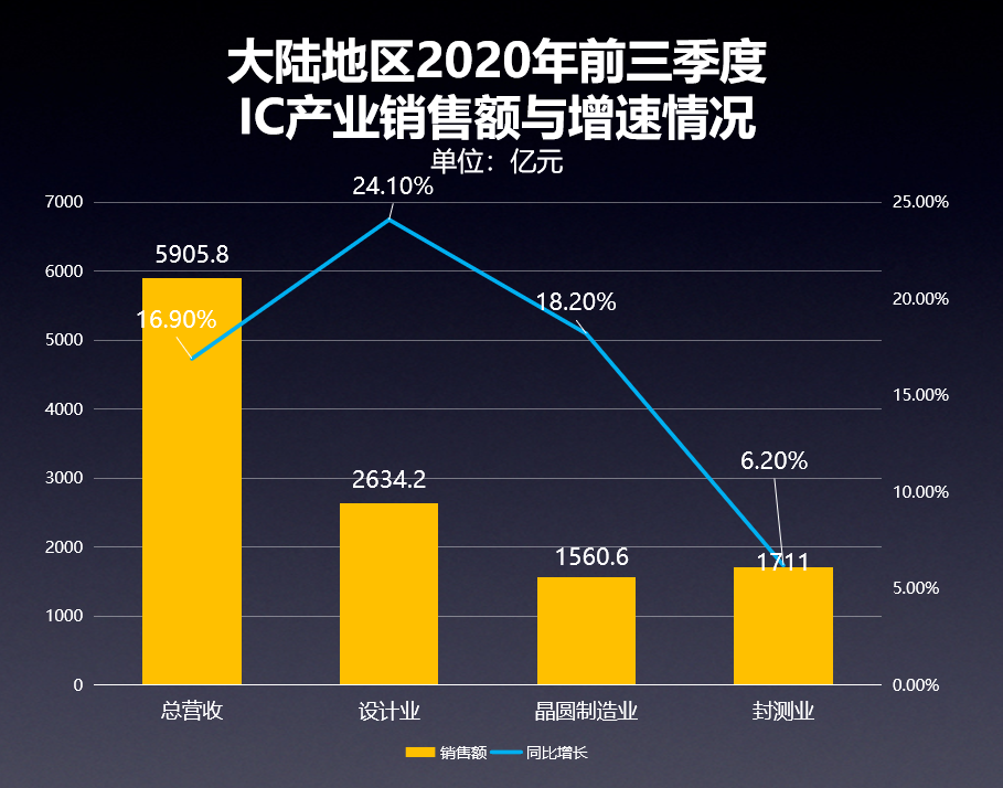 在2020这不平凡的一年中,中国半导体行业仍然有不错的发展,2020前三季度半导体营收达到了5905.8亿元,同比增长达到16.9%,但其中封测业仅有6.2%的增长,相比于设计业与晶圆制造业,封测业增速最低。