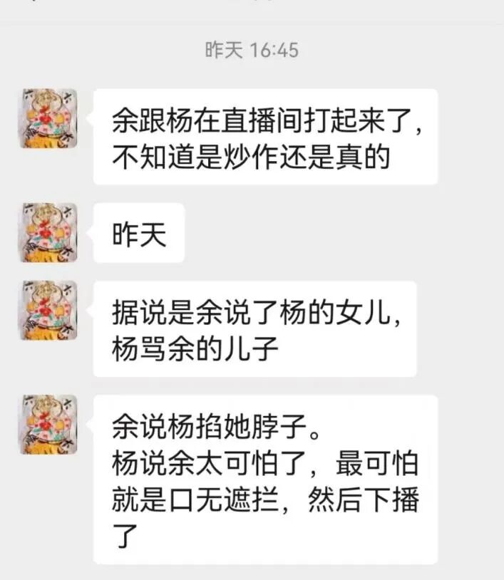 昨天下午四点多,朋友给我发微信:“余和杨在直播间打起来了,不知道是炒作还是真的。据说是余说了杨的女儿,杨骂了余的儿子。余说杨掐她脖子。杨说余太可怕了,最可怕就是口无遮拦,然后下播了。”